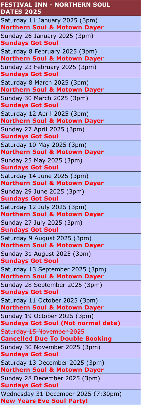 Come and join us at our most popular and longest running venue, The Festival Inn, Ilkeston Road, Trowell, Notts, where we have been putting on Soul Nights for 30 years - The longest running soul night at the same venue in the East Midlands.