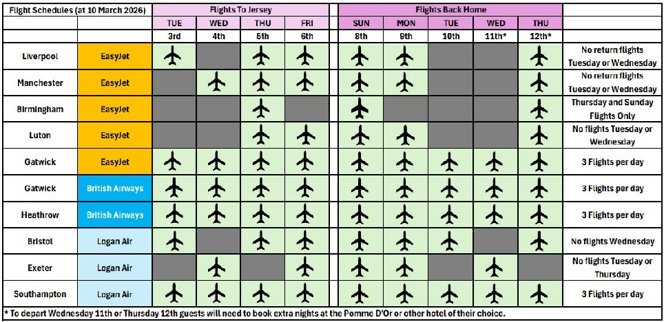 All airlines have now published their 2026 winter flying schedules. Guests are advised to book flights early to take advantage of the current lower prices, which will only increase as time passes and demand increases.